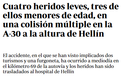 Fecha: 12 de mayo de 2019 Lugar: p.k. 94,000 de la A-30 (Murcia) Menores afectados: 1 fallecido (14 años), 2 heridos (15 y 6 años)