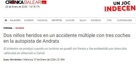 Fecha: 7 de enero de 2026 Lugar: Portals Nous (Mallorca) Menores implicados: 2 Más información: Crónica Balear